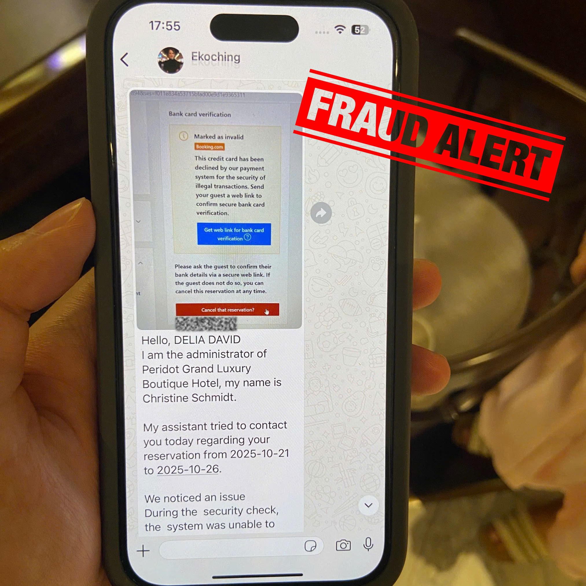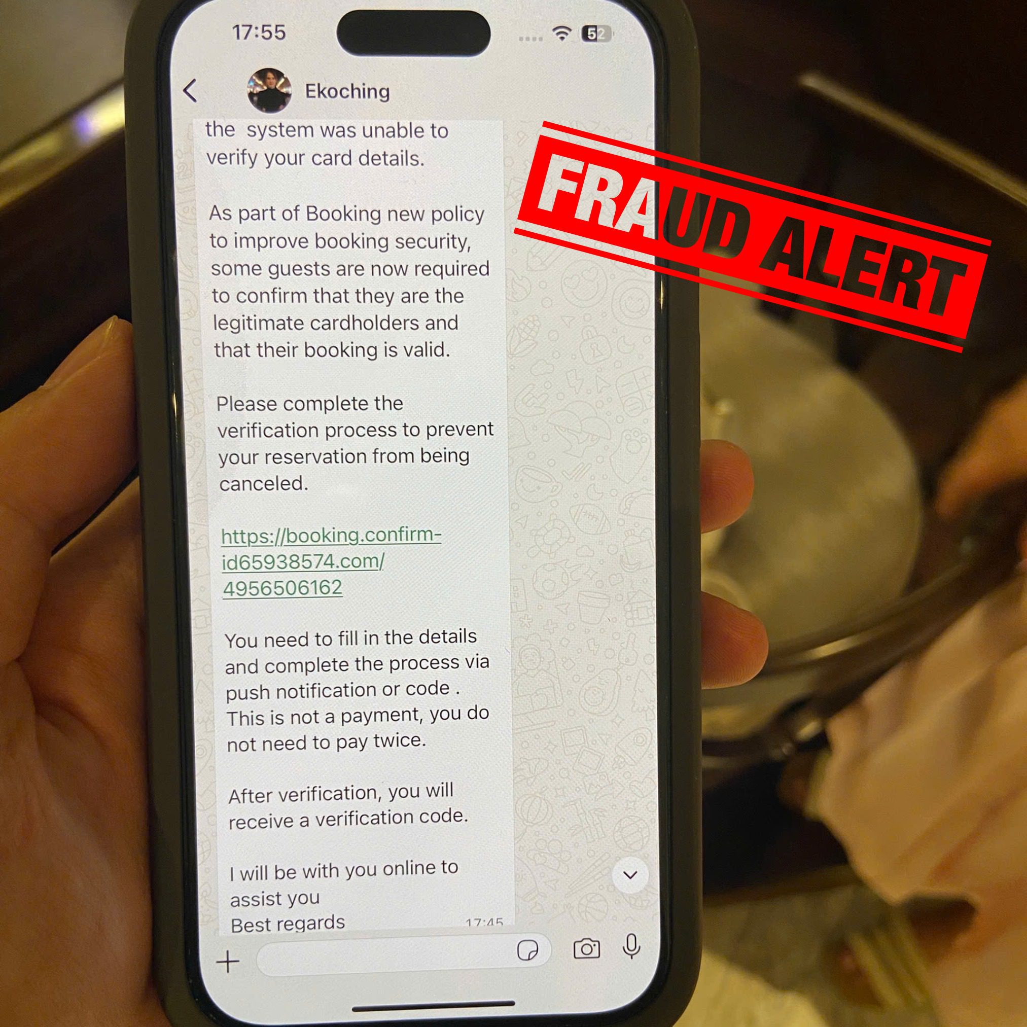 Recently, we have received reports that fraudulent messages have been sent by individuals impersonating hotel staff or Booking.com representatives, claiming that there was a “payment issue” and asking guests to verify their booking or enter credit card details through suspicious links.