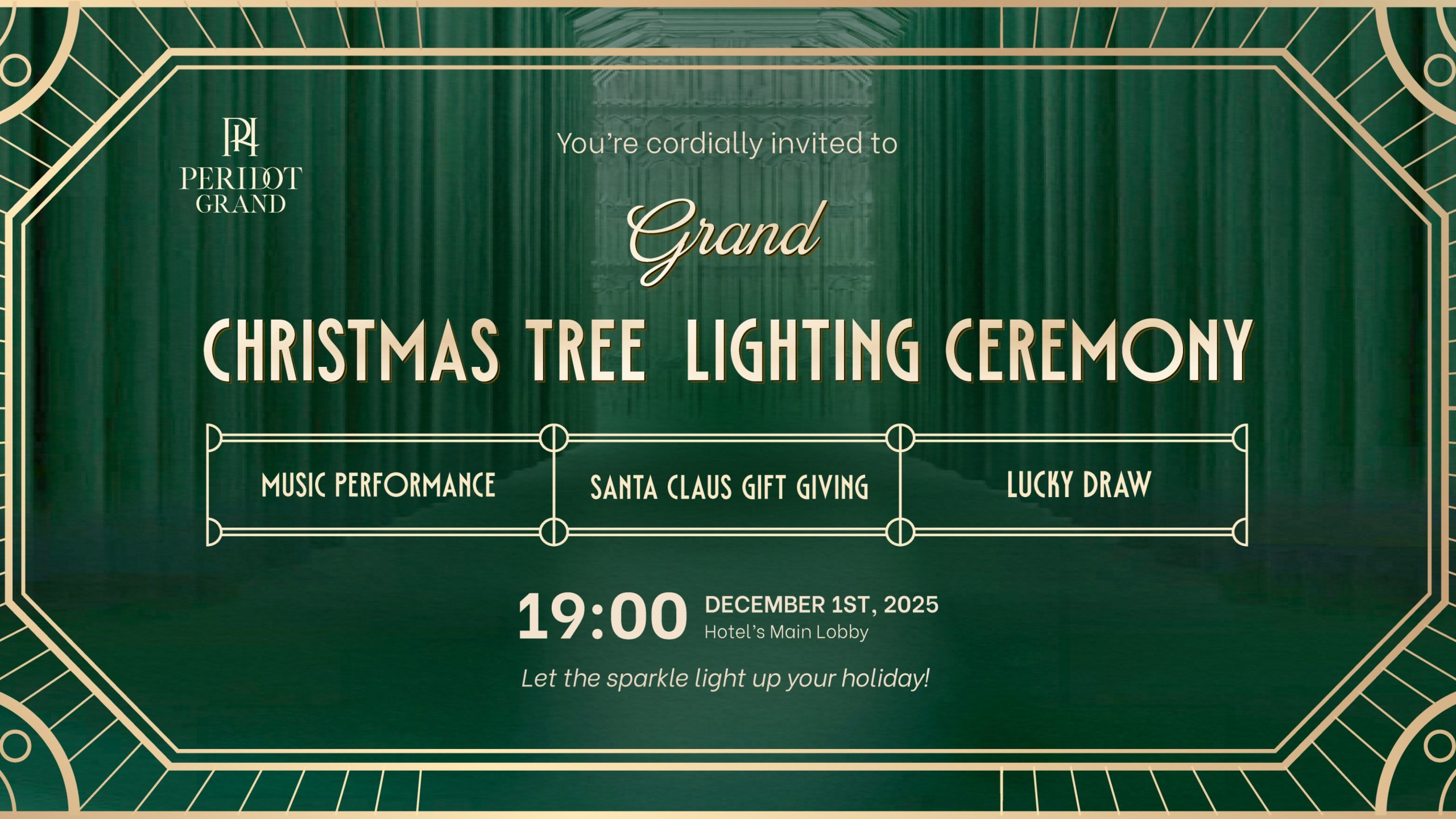 Hãy đến và trải nghiệm khoảnh khắc mở đầu mùa lễ hội tại Peridot Grand Hotel – nơi ánh sáng, âm nhạc và tinh thần kết nối hòa quyện để tạo nên một buổi tối ý nghĩa, trọn vẹn và khác biệt. Chúng tôi mong được chào đón bạn và những người thân yêu tại sự kiện Grand Christmas Tree Lighting Ceremony, để cùng nhau khởi động một mùa lễ hội thật ấm áp và đáng nhớ.